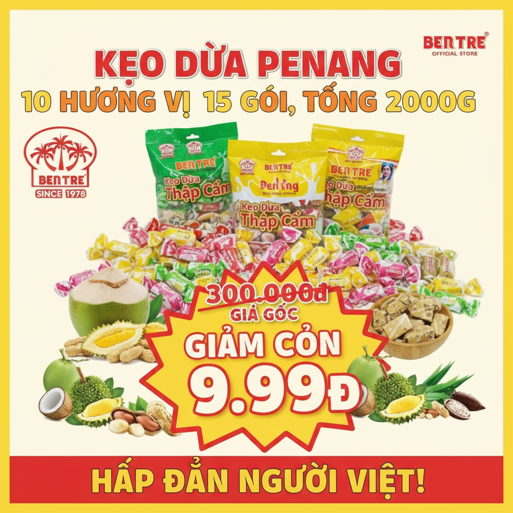 Kẹo dừa đậu Penang chính hiệu, 10 hương vị hỗn hợp, tổng cộng 15 gói, trọng lượng 2000g.